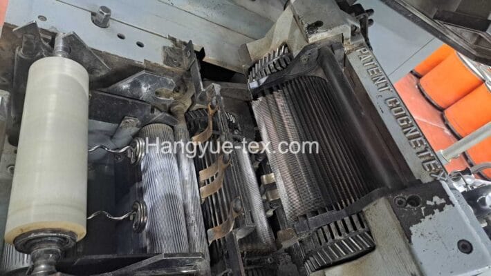 The 1993 Cognetex SC400 is a robust, high-precision intersecting gill box engineered for the demanding preparation stages of worsted and semi-worsted spinning. Manufactured by the Italian specialist Cognetex, this machine is renowned for its durability and its patented Rotary Flange Drive system, which allows for high mechanical speeds while maintaining smooth fiber control